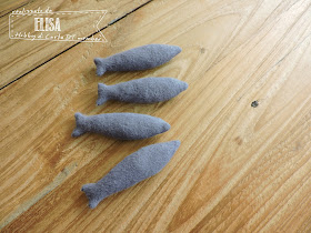 Le sardine sono davvero facilissime da realizzare: ho riprodotto il cartamodello sul feltro grigio e ho ritagliato le forme lasciando mezzo centimetro di margine. Ho cucito le due parti al rovescio, lasciando un'apertura lungo la coda e infine ho imbottito. Ho chiuso l'apertutra con ago e filo.